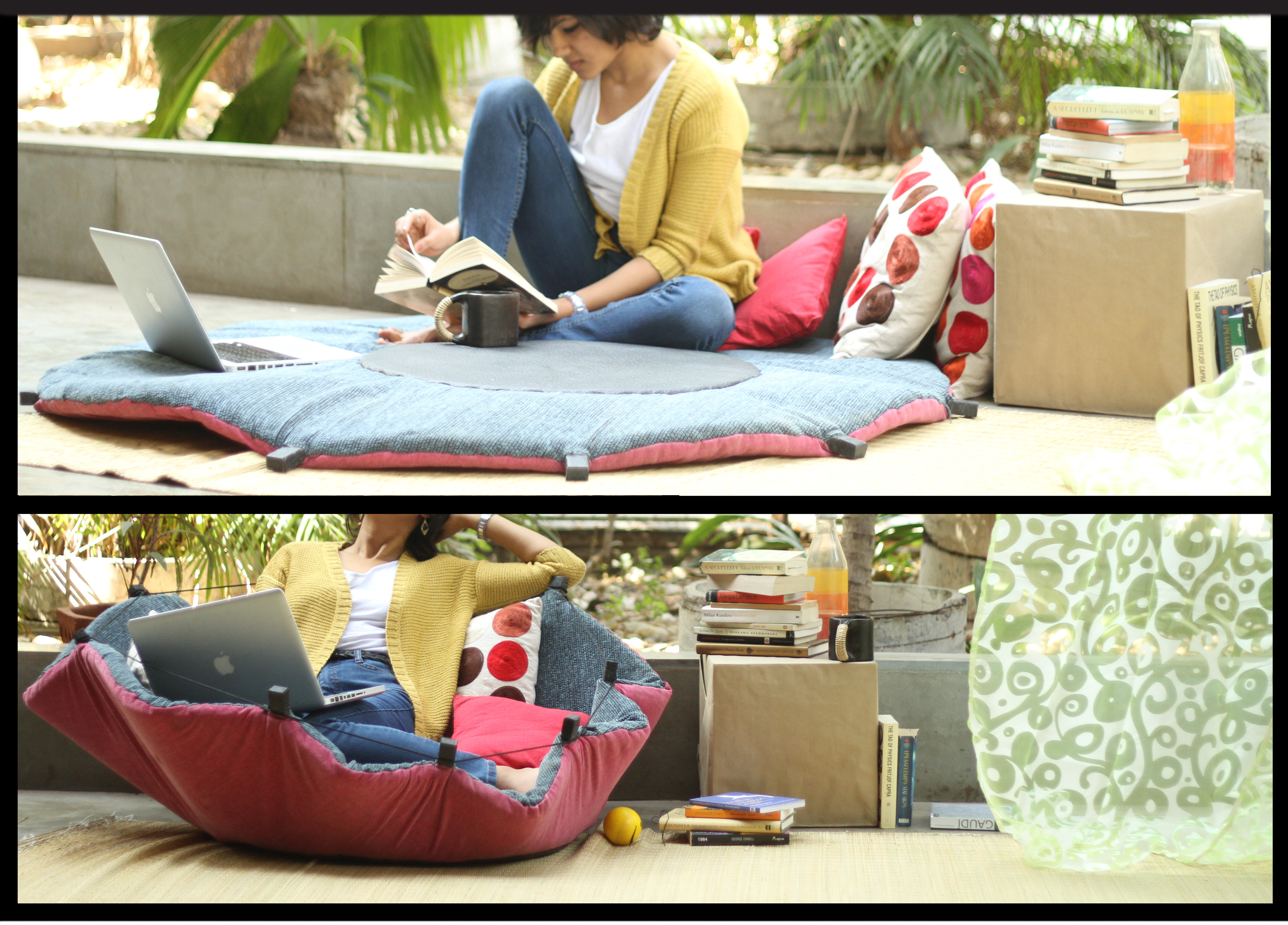 I then used the same at a larger scale to make a Seating Basket. It is a mat when open, and when ties it forms a comfortable and cozy basket to sit in.